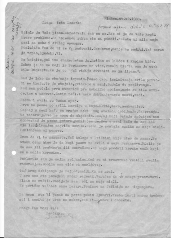 "Мирис липа... најављивао је њен долазак из Минхена у родно Беркасово. Било је у њој нешто Андерсеново, волела је децу. Често је посећивала школе у земљи и иностранству.